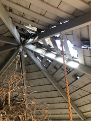 The chandelier that we had made with twigs was covered in ash and melted roof materials, so Scott took it down for me to clean and repair the branches and check out the wiring.